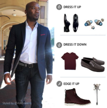 DRESS IT UP: Go for slacks instead of denim, add patent tux shoes and a pair of elegant cufflinks.